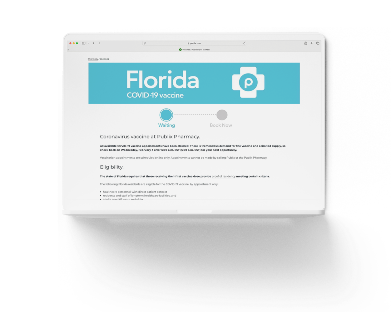 Designed a high-traffic vaccine landing experience, including a waiting room page that throttled user volume during peak demand. The layout prioritized clear status communication, reduced confusion, and reinforced trust while customers waited to enter the scheduling flow. Focused on fast load times and accessibility to support a seamless transition from awareness to booking.